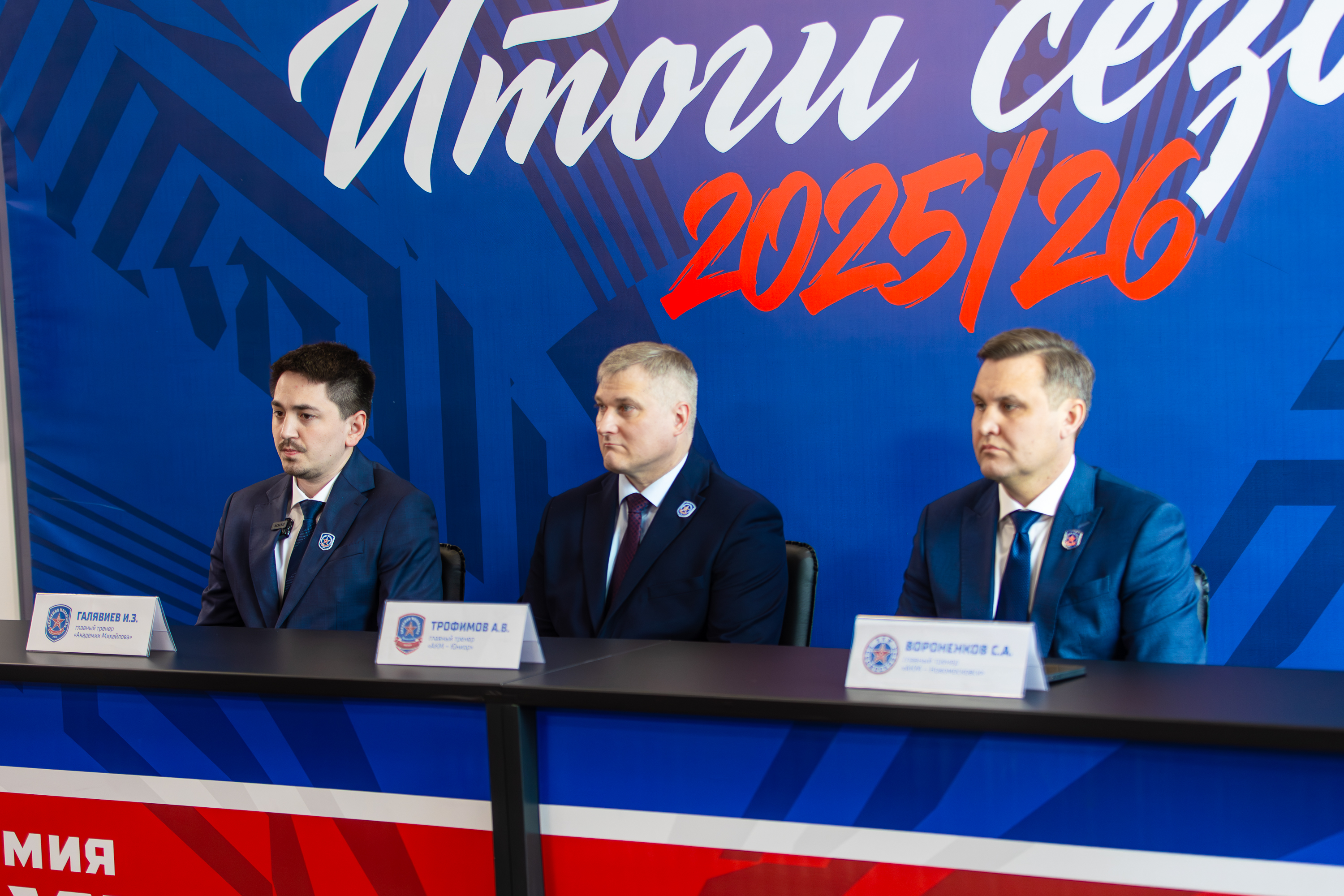 28 апреля в Ледовом дворце Тулы состоялась пресс-конференция, посвященная подведению итогов хоккейного сезона 2025/26 команд системы «Академии хоккея им. Б.П. Михайлова». На вопросы журналистов ответили статс-секретарь, заместитель министра спорта Российской Федерации Александр Александрович Никитин, Губернатор Тульской области Дмитрий Вячеславович Миляев, Председатель совета директоров Группы компаний «Полипласт» Александр Зинурович Шамсутдинов и главный тренер «АКМ-Новомосковск» Сергей Анатольевич Вороненков.